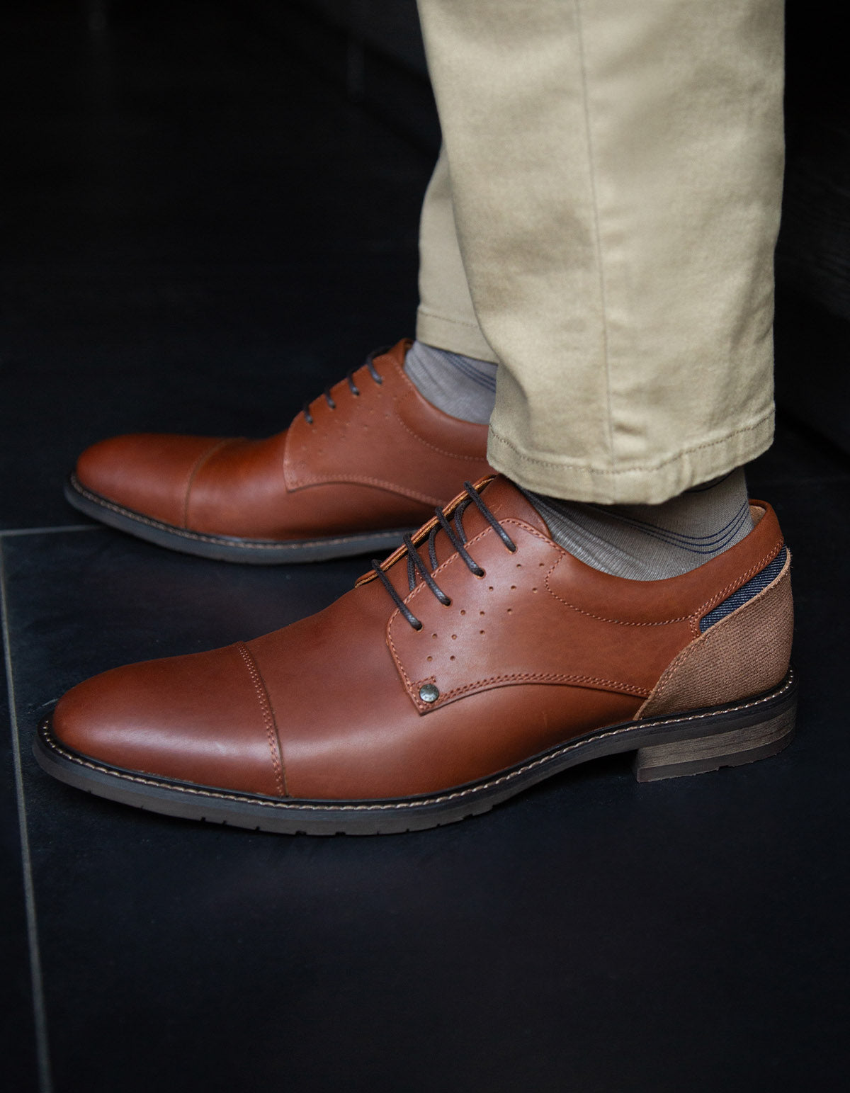Zapatos Corktown-0-02 de cuero color brandy, planta de goma y forro de textil y cuero, estilo derby con punta redondeada y un diseño con detalles de perforaciones para look semiformal o casual. Perfectos para oficina o cualquier ocasión semiformal.