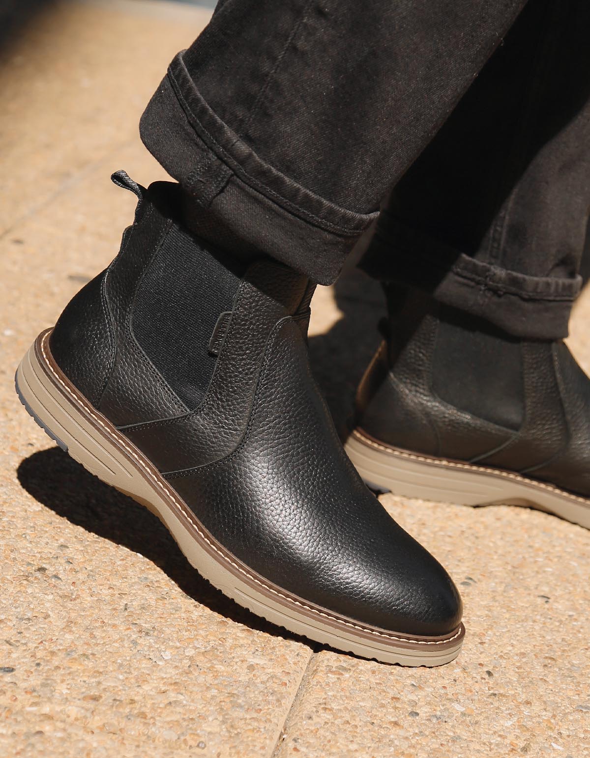 Descubre el botín de cuero negro tipo Chelsea, perfecto para tus looks de otoño e invierno. Este versátil botín cuenta con un acabado texturizado y elásticos laterales que aseguran un ajuste cómodo. Su suela de goma en color gris claro, con diseño de líneas horizontales y pequeño taco, ofrece estilo y estabilidad. La costura visible alrededor de la suela, en un tono café contrastante, añade un toque distintivo. Ideal para ocasiones casuales o semiformales, este botín es la elección perfecta para combinar con cualquier look.