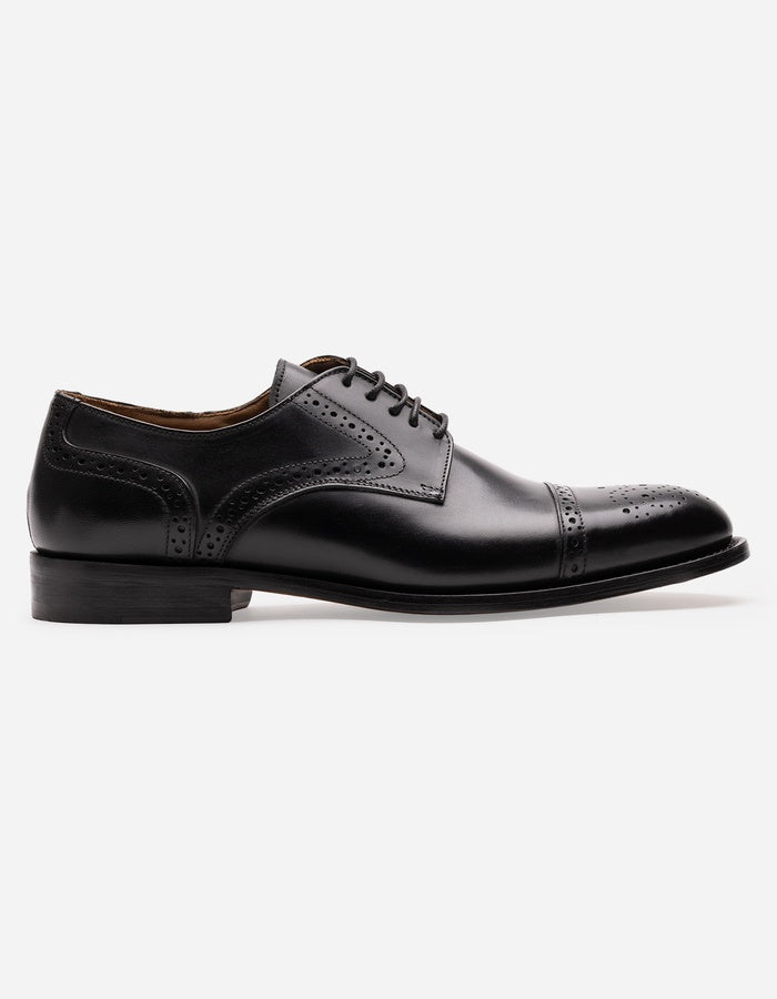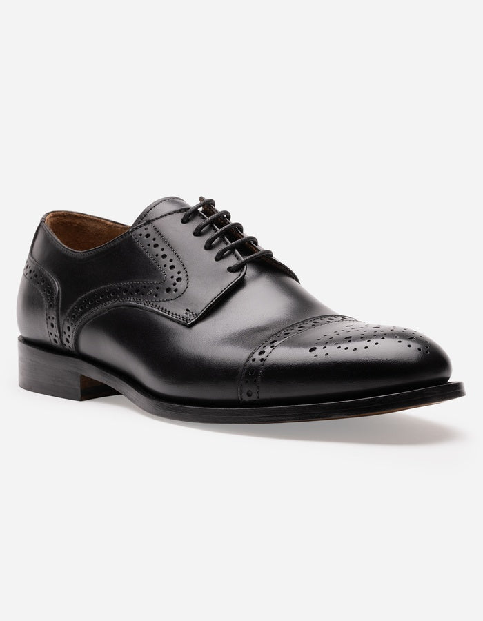 Zapatos formales Modena-0-04 de la línea Magno, confeccionados en Italia con cuero premium negro de primera calidad. Diseño derby clásico con cierre de cordones que asegura ajuste preciso y soporte óptimo. Detalle brogue en sobrepunta añade sofisticación y carácter a la silueta. Suela de cuero auténtico proporciona flexibilidad natural y transpirabilidad superior, ideal para uso prolongado. Forro interior de cuero genuino garantiza confort y regulación térmica. Construcción artesanal italiana asegura durabilidad excepcional y acabado impecable. Zapato versátil apto para contextos corporativos, eventos formales y uso ejecutivo.